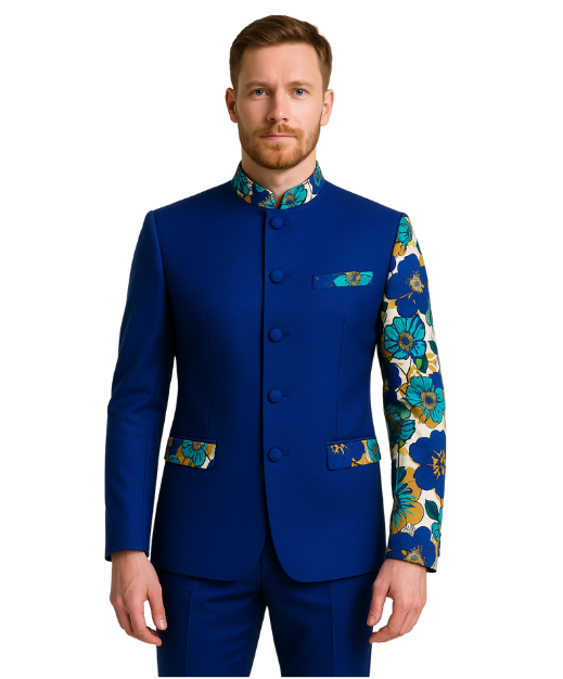 Manche droite intégralement en wax : cette manche unique transforme le costume en œuvre d’art vivante. Elle attire le regard, symbolise l’ouverture culturelle et fait le lien entre modernité occidentale et patrimoine africain.