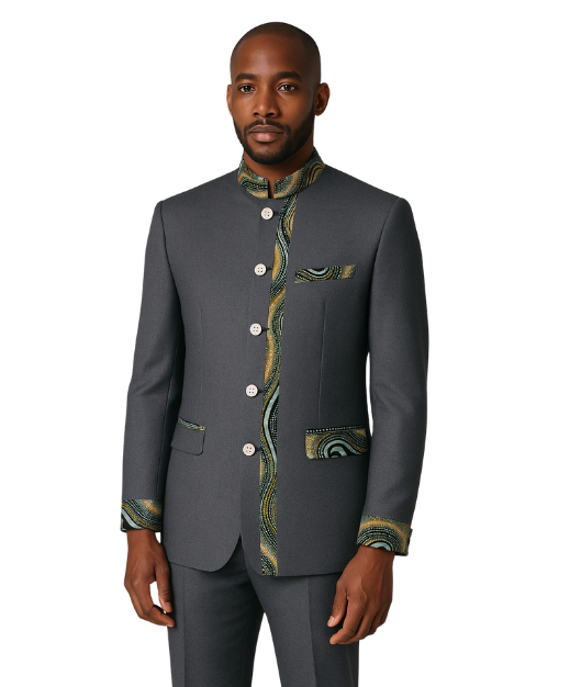 Le costume Bomoyi est une pièce au design raffiné et contemporain. Il adopte une coupe droite et élancée, mettant en valeur la posture et la prestance naturelle de celui qui le porte. La veste fermée par des boutons blancs contrastés évoque un équilibre entre tradition et modernité. Le col mao renforce l’aspect solennel de la tenue, tout en gardant une esthétique sobre et moderne.