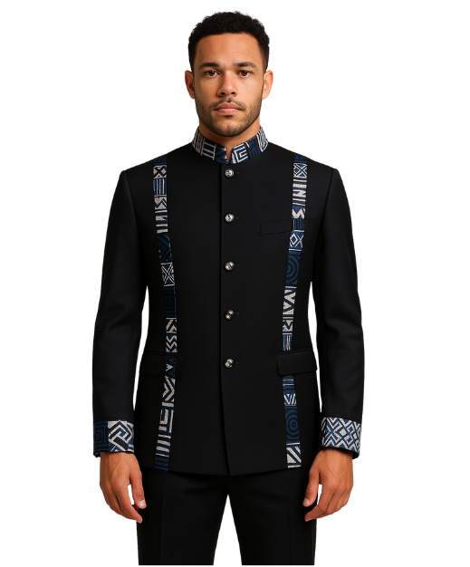 Le costume Lanmou Nwa incarne une silhouette droite, affirmée et épurée. Inspiré des tenues cérémonielles et des codes militaires revisités, il mélange autorité et élégance subtile. Sa structure rigide aux lignes verticales renforce la prestance de celui qui le porte, tout en gardant une modernité sobre et racée.