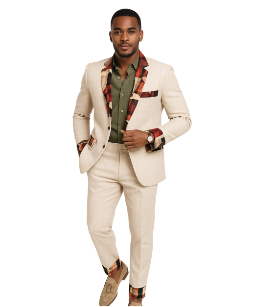 Ce costume confectionné en lin léger rose poudré incarne une élégance douce et contemporaine. Le tissu principal, fluide et respirant, épouse les formes sans contraindre, parfait pour les climats tropicaux.