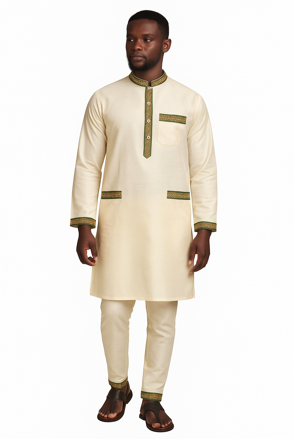 Col mao rehaussé d’une bande ornementale verte et dorée typique des tissages traditionnels africains, symbole de sagesse et de prospérité.