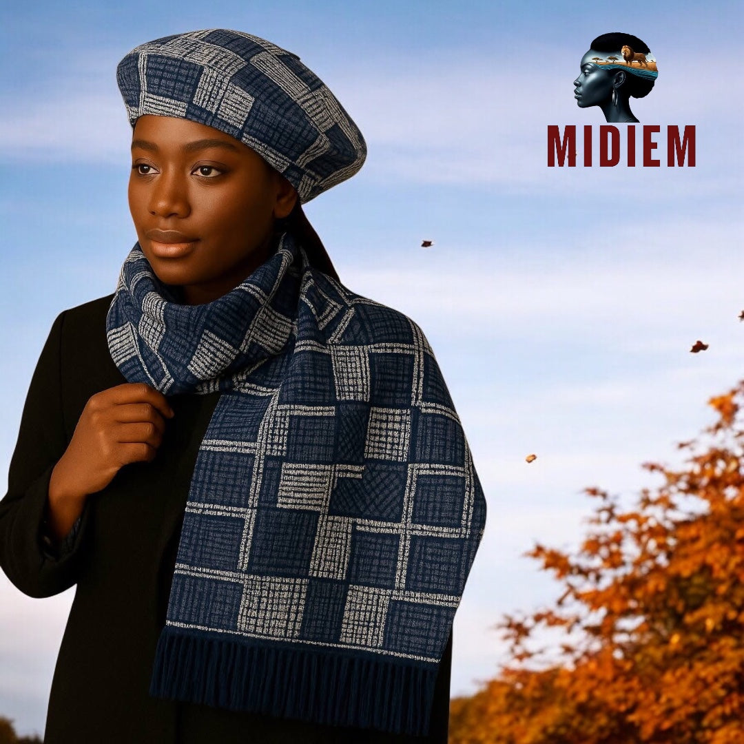 Ce dernier ensemble marie un bleu profond à des motifs géométriques ivoire, créant une harmonie élégante et intemporelle. Le motif rappelle les tissus bogolan et indigo d’Afrique de l’Ouest, symboles de sagesse et de noblesse. Le béret, structuré et chic, s’accorde avec une écharpe longue aux franges délicates. Ensemble, ils expriment la sérénité, la dignité et la beauté tranquille. Parfait pour une femme sûre d’elle, raffinée et connectée à ses racines.