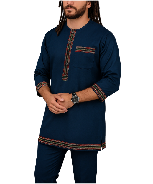 La tunique bleu foncé, longue et ajustée, descend légèrement au-dessus du genou. Elle est magnifiée par une bande tissée aux motifs berbères rayés, placée avec précision au niveau de la boutonnière verticale, de la poche poitrine, du col Mao et du bas des manches. Ces bandes colorées (dominantes de noir, rouge, vert, or et blanc) évoquent les tissus artisanaux de Kairouan et du Kef, ajoutant une profondeur culturelle à l’ensemble.