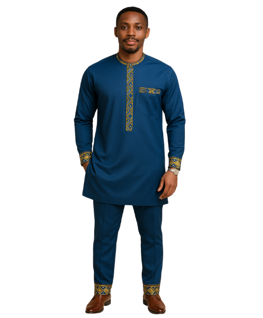 L’ensemble Han Minji est une tenue contemporaine inspirée du raffinement asiatique et de l’énergie vibrante de l’Afrique de l’Ouest. Confectionné en coton mélangé de qualité supérieure, il offre un équilibre parfait entre confort, fluidité et élégance structurée. Sa teinte bleu nuit confère une allure sobre et prestigieuse, tandis que les bandes en tissu wax noir et or, ornées de symboles géométriques traditionnels africains, rehaussent le col, les poignets, la boutonnière et la poche poitrine.