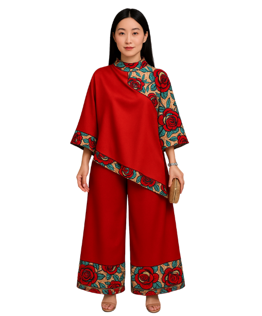 🔹 Pantalon large fluide : Confectionné dans le même tissu rouge soyeux, le pantalon offre une coupe ample et fluide qui allonge la silhouette. Le bas des jambes est subtilement décoré d’une bande de wax, en écho au haut.
