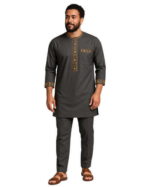 L’ensemble “Mutima W’Imana” incarne l’élégance sobre et le raffinement discret, tout en s’ancrant dans l’héritage textile d’Afrique de l’Est. Fabriqué à partir d’un coton mélangé de haute qualité, il offre à la fois douceur, fluidité et une excellente tenue. Sa teinte gris foncé anthracite, sobre et contemporaine, confère au porteur une allure à la fois sérieuse et charismatique.