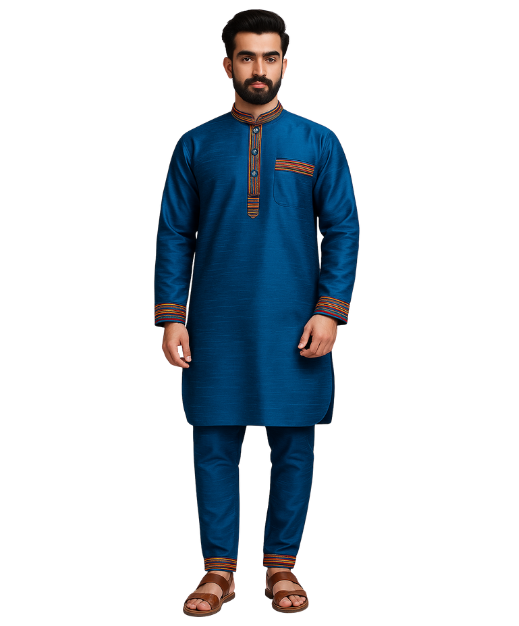 Fermeture : patte de boutonnage décorée également de la bande ethnique, ajoutant contraste et raffinement.