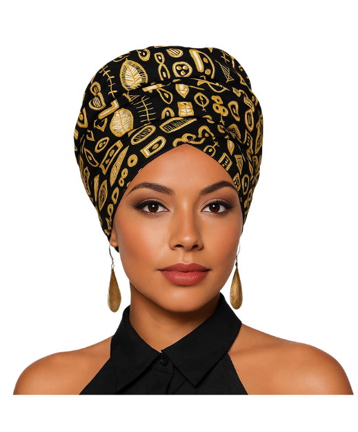 Polyvalent et sophistiqué, ce foulard peut être porté de multiples façons : noué en turban haut pour une allure royale, en bandeau stylé pour un look urbain-chic, ou drapé autour des épaules comme une étole graphique. Il incarne la fusion parfaite entre patrimoine africain et audace contemporaine.