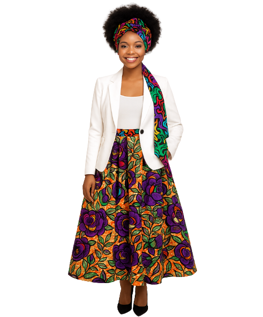 La jupe Rose Misozi incarne l'élégance florale et la richesse du tissu wax africain. Confectionnée dans un tissu éclatant aux motifs de grandes roses violettes entourées de feuillage vert sur un fond orange texturé, cette jupe midi est un véritable chef-d'œuvre textile. Sa coupe évasée et ample, à plis creux, offre un volume majestueux qui accompagne chacun des pas avec fluidité et prestance.