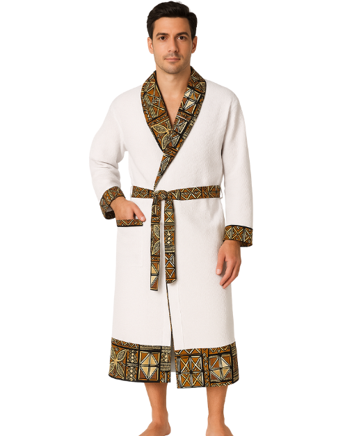 Élégance italienne et chaleur africaine fusionnent dans le peignoir Roma Soleil. Conçu en coton gaufré blanc d'une grande douceur, il est subtilement rehaussé par un tissu wax aux motifs géométriques bruns, ocres et noirs, inspirés de l'art tribal africain. Ce wax orne généreusement le col châle, la ceinture nouée à la taille ainsi que le bas des manches et de l’ourlet, apportant une touche d’exotisme et de caractère à cette pièce intemporelle.