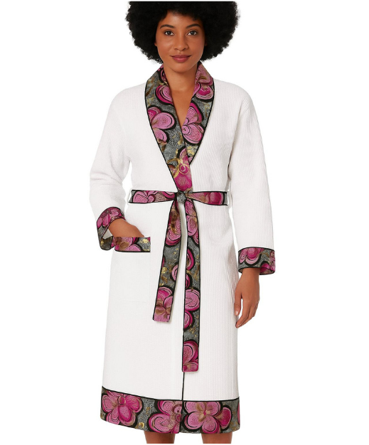 Le Peignoir Sol de Bahia incarne la chaleur, la joie et l’élégance insouciante du Brésil. Fabriqué en coton gaufré blanc doux et léger, ce peignoir de détente est sublimé par un wax aux motifs ethniques vibrants dans des tons rouge feu, orange soleil et jaune mangue. Ce tissu africain orne généreusement le col châle, la ceinture et les extrémités des manches ainsi que l’ourlet, créant un contraste éclatant et festif.