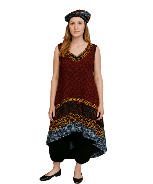 Cet ensemble unique associe une tunique ample sans manches en tissu texturé bordeaux profond à des détails chatoyants aux motifs ethniques en noir, jaune ocre et bleu. La tunique est ornée de bandes imprimées à la base et aux épaules, créant un contraste élégant et vibrant. Elle est accompagnée d’un pantalon noir fluide et d’un béret assorti aux imprimés, qui donne une touche bohème et affirmée.